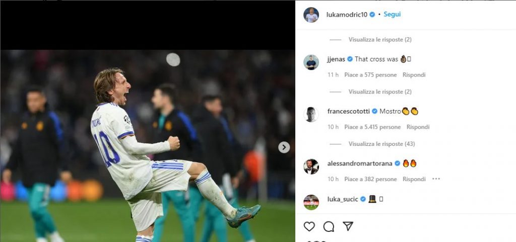 L’ex capitano giallorosso ha commentato il post Instagram del croato ha commentato dicendo “Sei un mostro”, con tanto di emoticon con gli applausi.