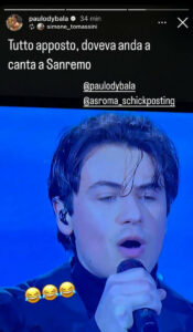Momento di leggerezza per Paulo Dybala e i tifosi della Roma durante la serata delle cover al Festival di Sanremo. Sul palco si sono esibiti Benji e Fede, e un tifoso giallorosso ha notato la somiglianza di uno dei due artisti con l’attaccante argentino. “Tutto a posto, doveva andare a Sanremo”, ha scritto il tifoso su Instagram, ironizzando sull’infortunio subito da Dybala contro il Porto.