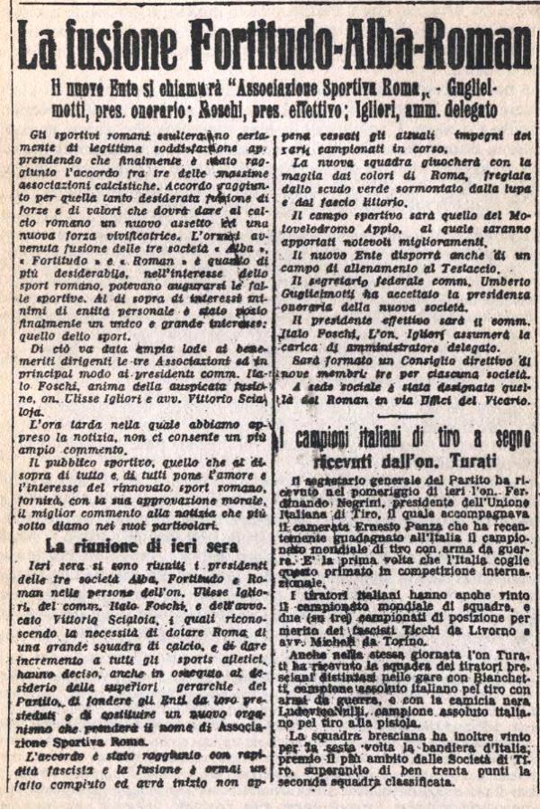 La decisione di fondere più società calcistiche fu dettata da un’esigenza sportiva precisa: creare una squadra competitiva capace di affrontare le grandi del Nord, che da anni dominavano la scena del calcio italiano. L’idea era promossa con convinzione da Italo Foschi, dirigente fascista con incarichi nello sport, che vedeva in un’unica squadra romana la possibilità di colmare il divario con le potenze settentrionali.