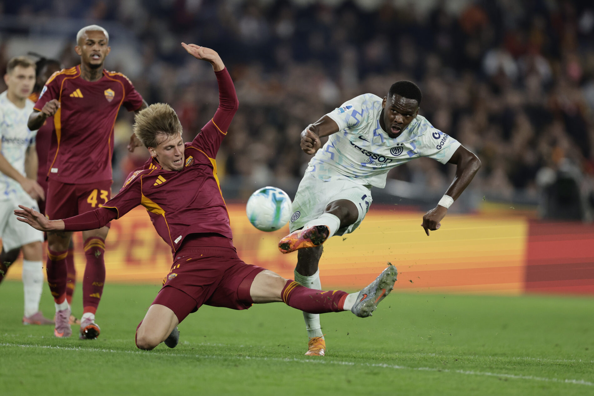 Contro l’Inter il pressing alto ha permesso a Niccolò Barella di servire Ange-Yoan Bonny, che in solitaria si è involato verso la porta giallorossa e ha trafitto il numero 99. Le transizioni veloci mettono in difficoltà la difesa giallorossa.